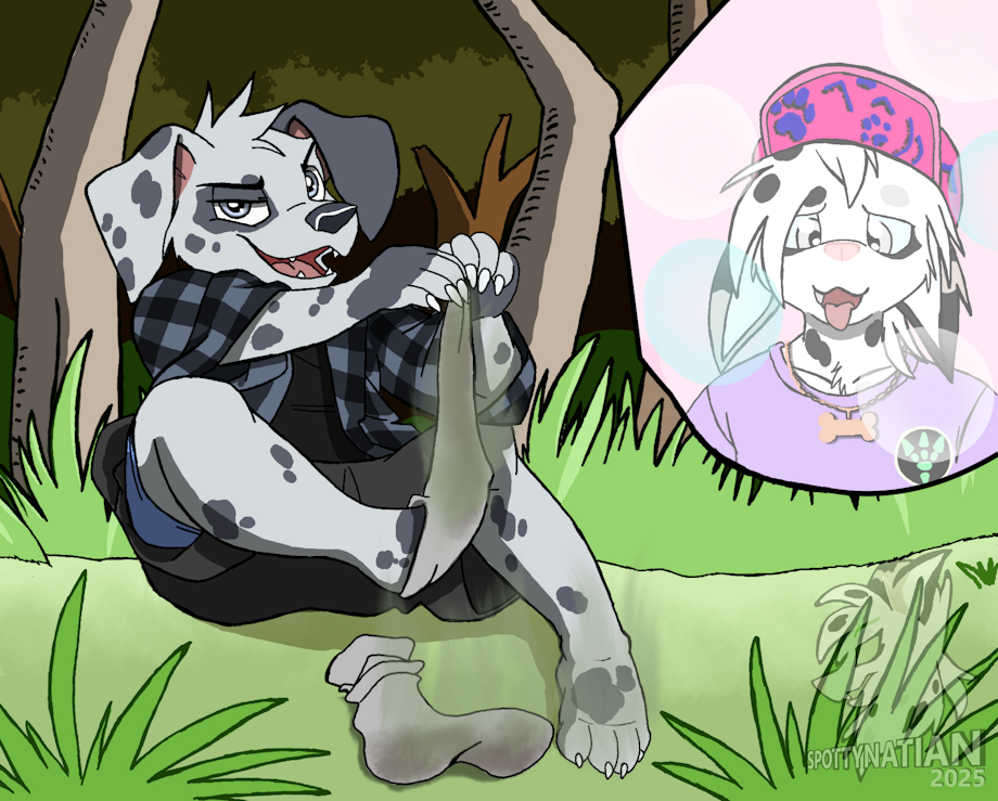 "Hey Girly! Get ready to lick my tired feet!!" Said the blue spotted Dalmatian, demanding the shyly Tricolored Dalmatian Reno to come closer and worship the bully's dirty stinky beans. Ofc Reno, being a foot lover that he is, couldn't resist.
