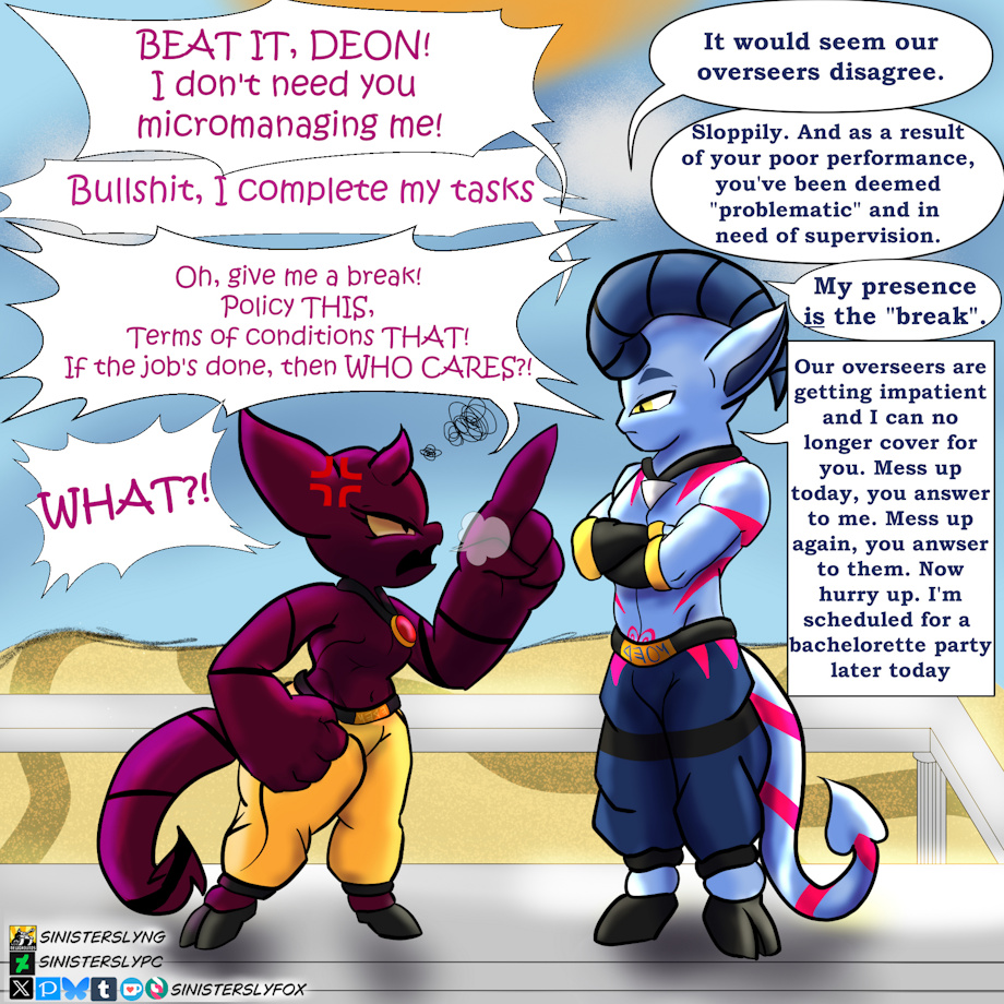 When I made Deon, I tried thinking of ways to make him seem like more of a driving force in Nere's life. I initially pictured Nere being more chaotic and Deon more lawful. Then I thought, why stop there? But for now, here Deon issues Nere a warning.