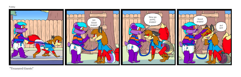 Illustration of Toffee the wet and messy diapered lion holding his diaper and filling it while looking at the viewer in front of the changing table. "Chat have yall made yuckypants today?"