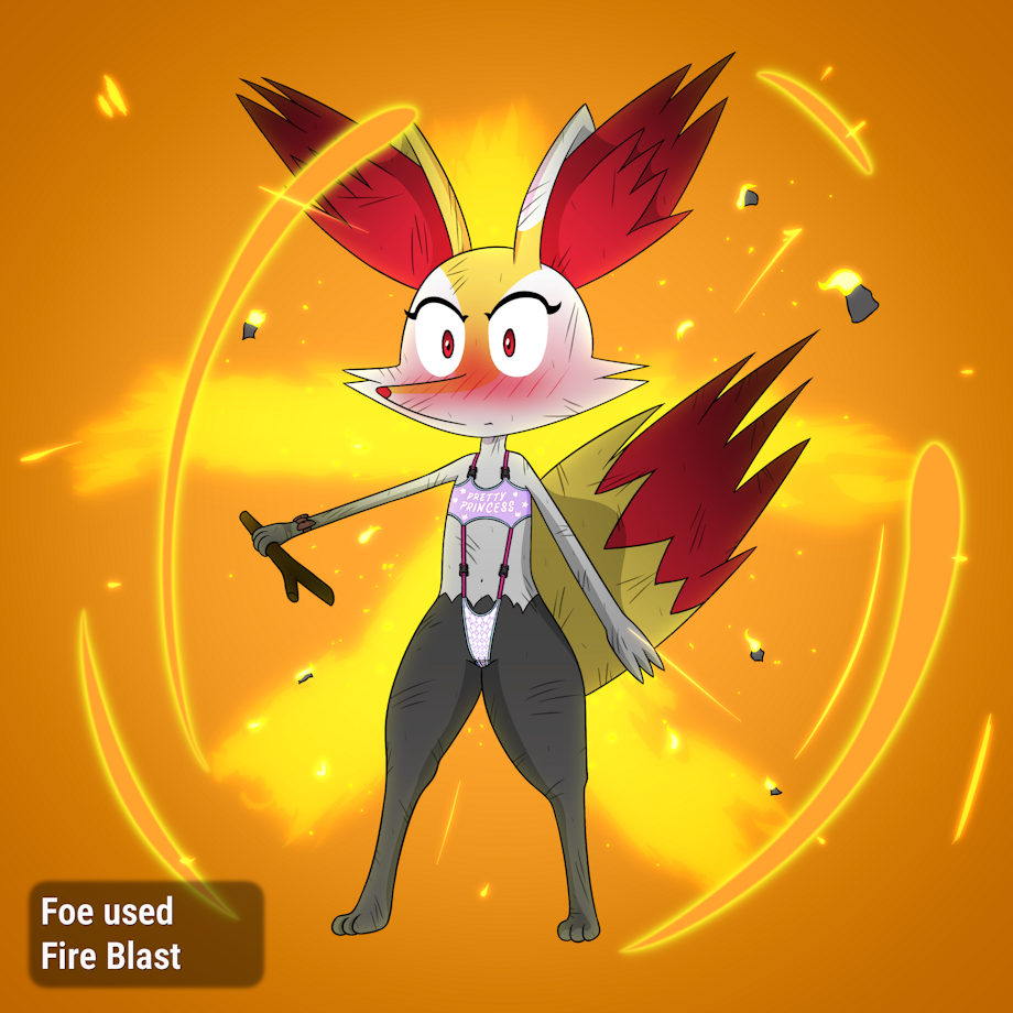 Scarlet gets attacked, her dress burns up, she freezes in shock and embarrassment. But she can hear a distinct sound of a liepard in the background saying "oh, wow ...". Scarlets face becomes even more red as she curls up to hide her underwear.