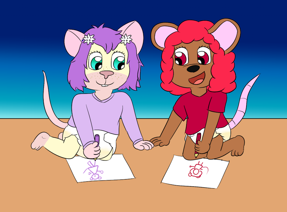 Rissa & Rika doodling on paper with crayons that match their favorite colors