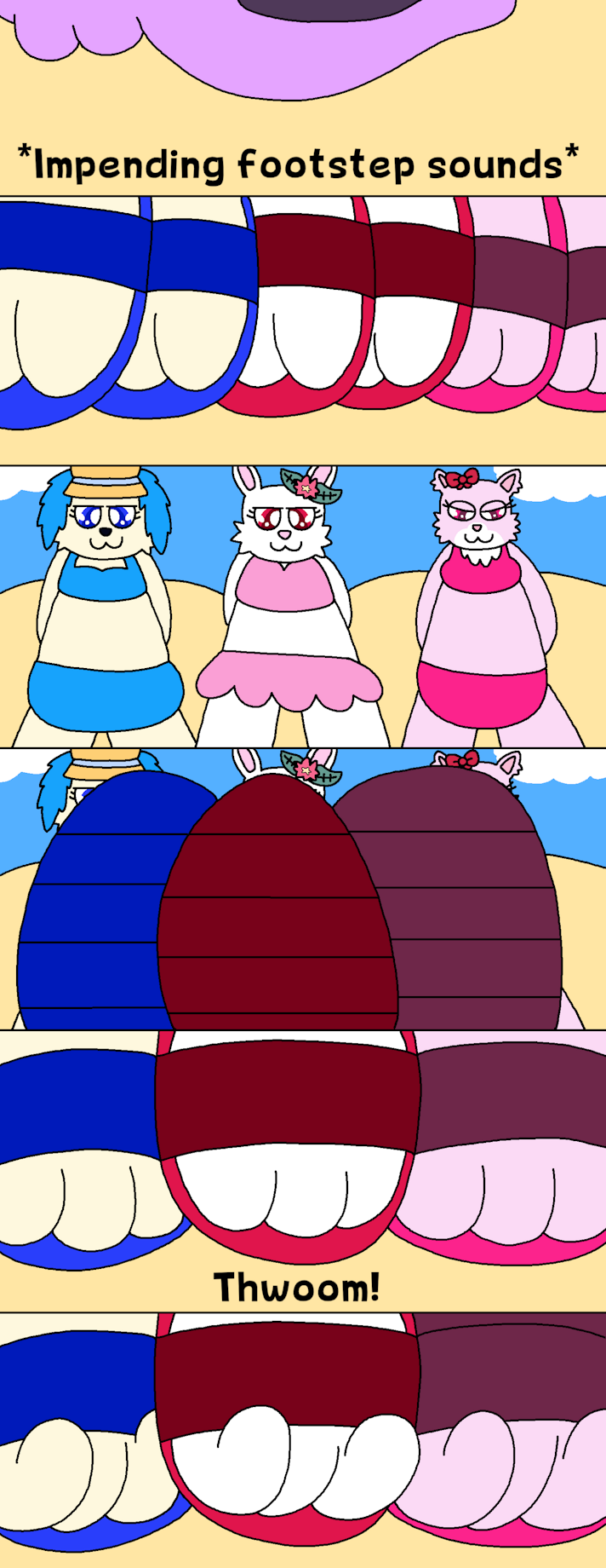 You find yourself shrunken at a beach, but something's off as you see that the conch shell is bigger compared to you. That's when you hear impending footsteps with six feet belonging to Ruby, Sapphie and Garnet, all wearing bikinis. They look down at you and think you're a bug, so they all squish you flat under their sandaled soles as they even wiggle their toes in delight. That's pretty much it. Anyway, hope y'all enjoy as usual. ^^ -- Jewelpet(c) Sanrio, Sega Fave