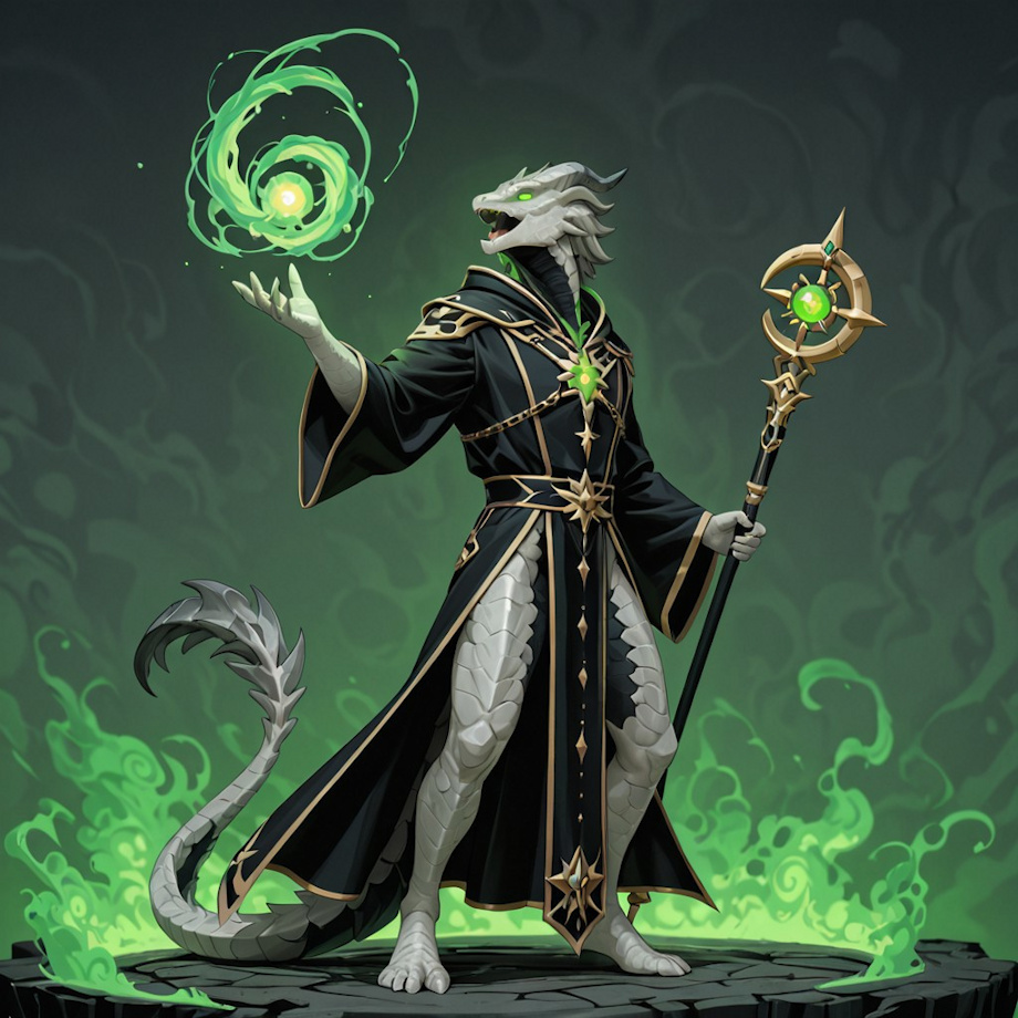 prompts:Dragon, two tone scales (black & gray), main scale color (black), scale accent color (gray), Horns (curled upwards), green glowing eyes, enveloped in green smoke, humanoid body, standing on 2 legs, roaring, wearing mage robes, holding magic staff up, anthropomorphic,