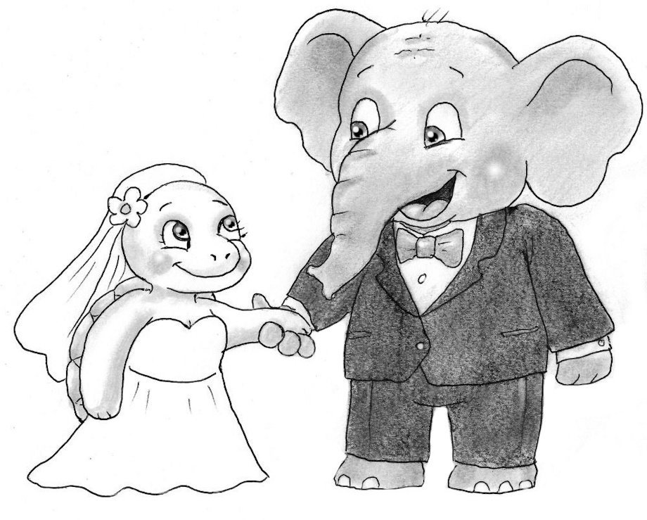 Commission for a wedding announcement - bride likes turtles, groom likes elephants.