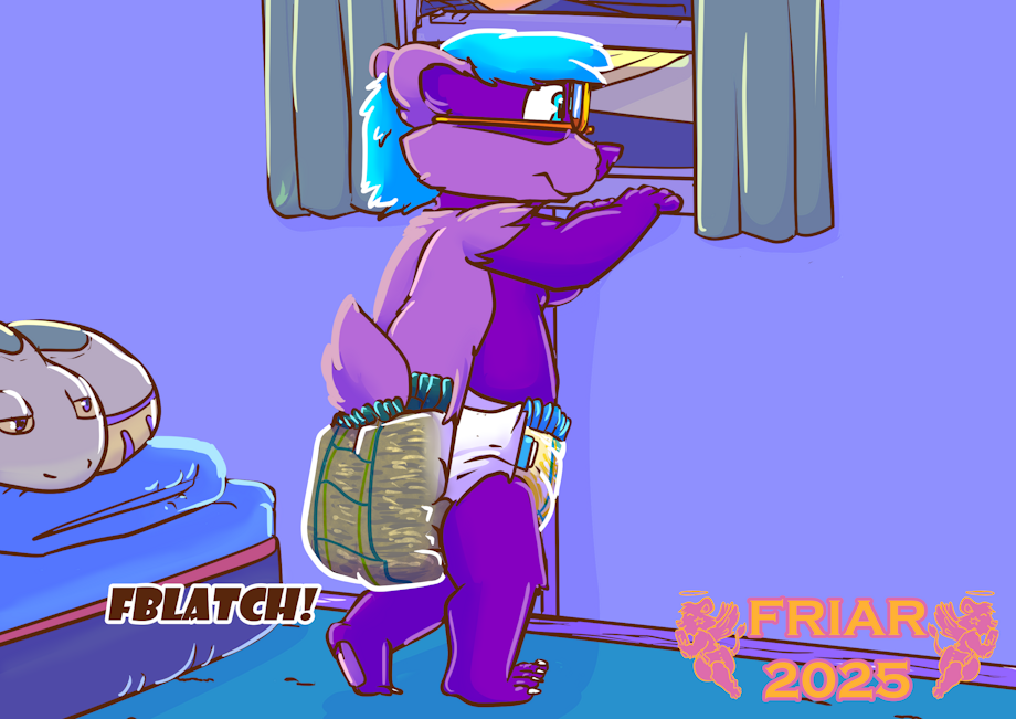 Illustration of Everett the wet and messy diapered badger peering through the window of his bedroom out at the other trailers while smiling. His snake plushie watches from the bed.