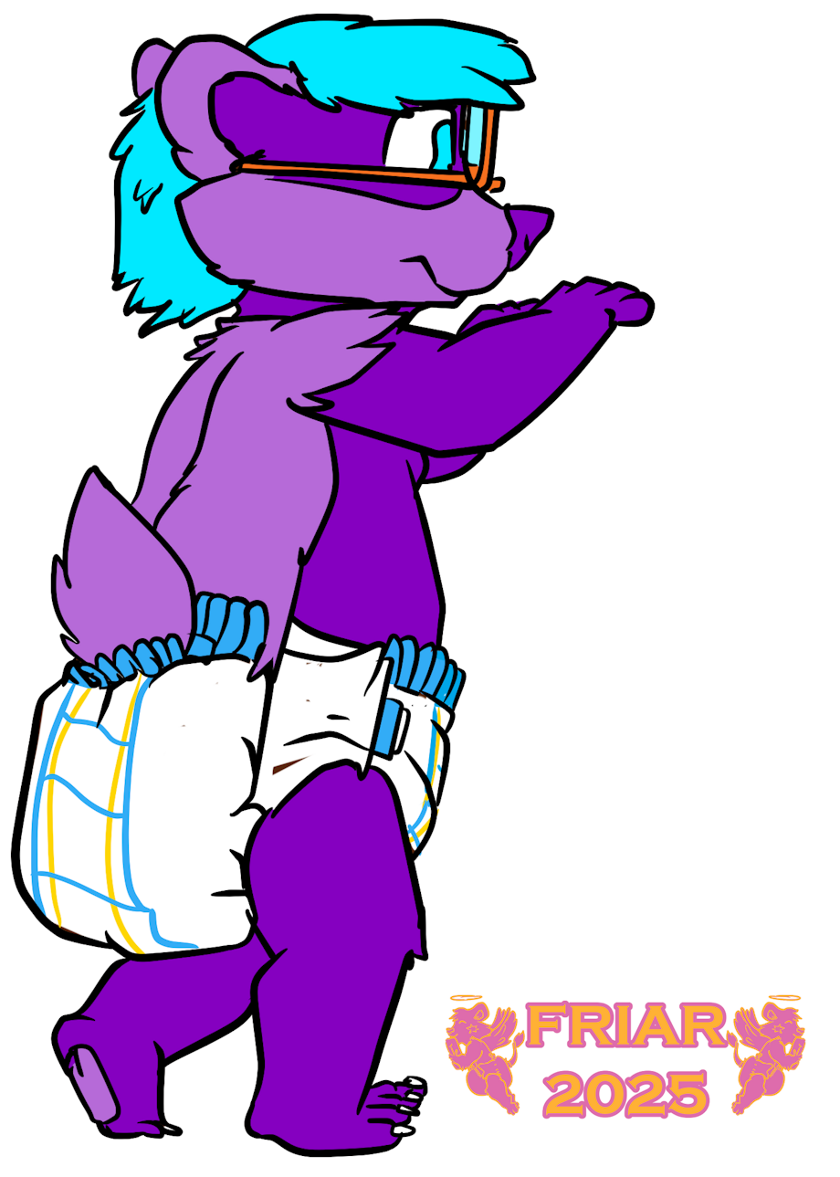 Illustration of Everett the wet and messy diapered badger peering through the window of his bedroom out at the other trailers while smiling. His snake plushie watches from the bed.