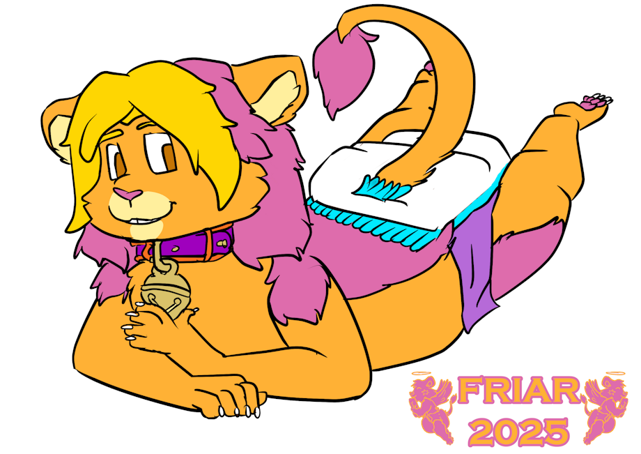 Illustration of Friar the wet and messy diapered lion flopped out on his tummy on the changing table, holding the bell from his bell collar. "Can you wait a sec? I'm not done making yuckypants just yet."