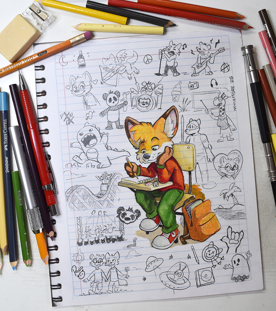 The idea of this piece started during a day I forgot my tablet or any other device and I had to stay for many hours in a restaurant, and at least a friend brought a sketchbook and some pencils I could borrow. And my memories of feeling like that came back to me, so I did a doodle of a fox drawing while boring at his school desk. But this final colored piece was drawn over a Mix Media paper sheet where I printed the scan of a real notebook (if I had decided to draw over a real notebook sheet, it wouldn't have held the layers of color pencils on it). And I decided to play an educational podcast to feel like if I was in a class room, doodling again whatever came in my mind, but mainly I was reminding some doodles I remember really doing during high school.