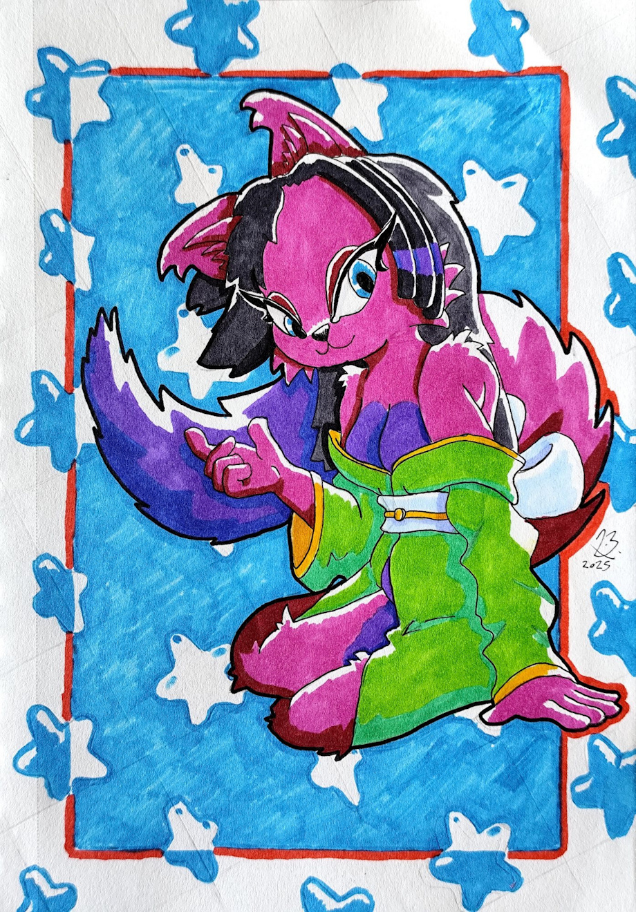Alt: Arkaia the Deer sits on her knees, with her left arm behind her, and her right arm bent behind her head. She's wearing a blue 2 piece bikini, a necklace and a golden arm band. She has pink and gray colored fur, brown antlers and bright blue eyes. Behind her is a beach themed design.