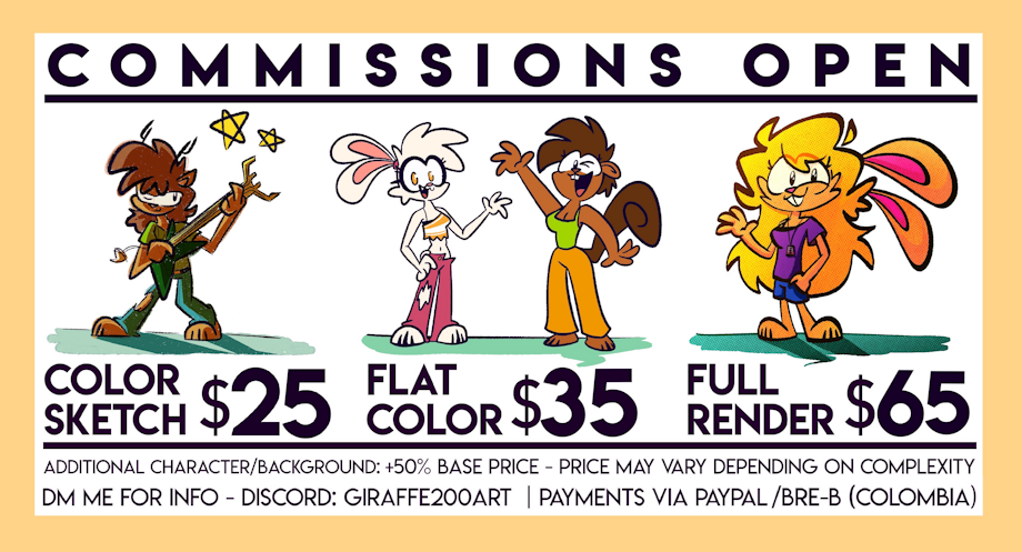 For anyone interested, please DM me here or to my Discord giraffe200art