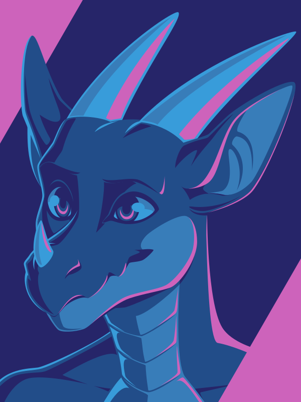 [A vector portrait of an anthro dragon, drawn in flat colors: dark purple, three shades of blue, and pink]
