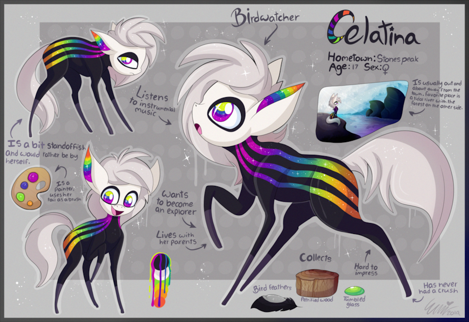 She's a little pony with rainbow markings who lives in stones peak and has ambitions on becoming a explorer and documenting new places, creatures and civilizations previously unheard of by most of of the developed world. she is a bit aloof and generally keeps to herself but is a really good artist who uses her tail as a paintbrush.