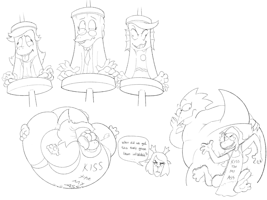 This was a commission for Aster! Susie's really being put through it, she's getting blown up into a lawn decoration, sat on by Alphy, then smashed in a compacter with Alphy and Undyne!