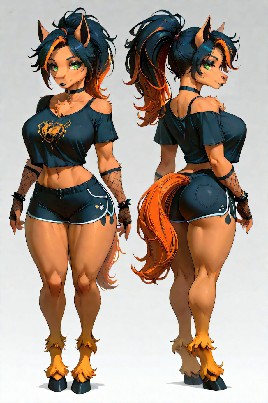 <lora:character_Sheet_XL:0.8> character sheet, Multiple views, simple background masterpiece, high quality, detailed fur, high detail, 4k, detailed background (solo, standing, black shirt, fishnet gloves, fingerless gloves, fishnet shirt, fishnets, black shorts:1.4) <lora:(1) FenrisXL Lighting:1> <lora:(1) Mjölnir (SDXL Lighting):1> <lora:photorealistic anthro 2:1> furry <k3rr4> (female:anthro:voluptuous:ponyta:1.7), (large breasts:1.4), (black hair, orange highlights, chest tuft:1.3), (green eyes, black pupils:1.4), (shoulder length hair, ponytail, hair to the side:1.4), (hooves:1.3), (black choker:1.8), (horse girl:1.4), (red tail:1.3), (brown skin, brown nose:1.4), (black inner ears:1.4), (black eyeshadow, full eyelashes, black lipstick:1.4) Negative prompt: cum, human, humanoid, bloodshot eyes, arms behind back, hands behind back, blurry, blurry background, bad anatomy, bad hands, three hands, three legs, bad arms, missing legs, missing arms, poorly drawn face, bad face, fused face, cloned face, worst face, three crus, extra crus, fused crus, worst feet, three feet, fused feet, fused thigh, three thigh, fused thigh, extra thigh, worst thigh, missing fingers, extra fingers, ugly fingers, long fingers, horn, realistic photo, extra eyes, huge eyes, 2girl, amputation, disconnected limbs, worst quality, normal quality, low quality, low res, blurry, text, watermark, logo, banner, extra digits, cropped, jpeg artifacts, signature, username, error, sketch ,duplicate, ugly, monochrome, horror, geometry, mutation, disgusting, jpeg artifacts, , NEGATIVE_HANDS ac_neg2 p0rnXL-neg DeepNegative_xl_v1 BeyondV3-neg Steps: 30, Sampler: DDIM, Schedule type: SGM Uniform, CFG scale: 3, Seed: 677600774, Size: 512x768, Model hash: 171e88f0da, Model: yiffymix_v62Noobxl, Denoising strength: 0.11, ADetailer model 2nd: face_yolov8s.pt, ADetailer confidence 2nd: 0.3, ADetailer dilate erode 2nd: 4, ADetailer mask blur 2nd: 4, ADetailer denoising strength 2nd: 0.4, ADetailer inpaint only masked 2nd: True, ADetailer inpaint padding 2nd: 32, ADetailer version: 25.3.0, Hires upscale: 1.5, Hires steps: 20, Hires upscaler: 4xUltrasharp_4xUltrasharpV10.pth, Lora hashes: "character_Sheet_XL: 4c59246e5115, (1) FenrisXL Lighting: c49df8024095, (1) Mjölnir (SDXL Lighting): 368d428918ac, photorealistic anthro 2: bed53d4c8b68", TI: "NEGATIVE_HANDS, ac_neg2, p0rnXL-neg, DeepNegative_xl_v1, NEGATIVE_HANDS, ac_neg2, p0rnXL-neg, DeepNegative_xl_v1", Version: f2.0.1v1.10.1-previous-224-g90019688 |