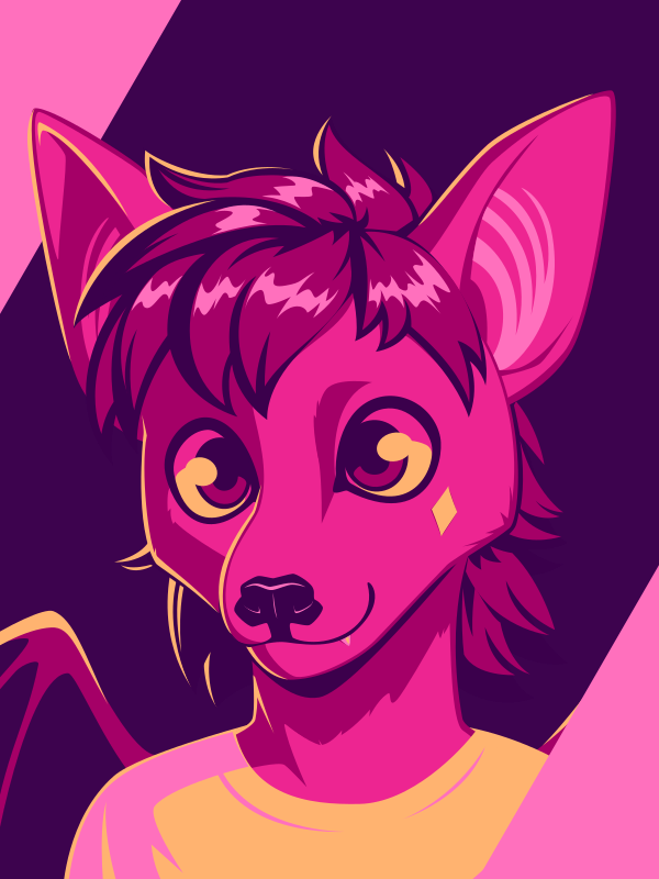 [A vector portrait of an anthro bat, drawn in flat colors: dark purple, three shades of pink, and yellow]