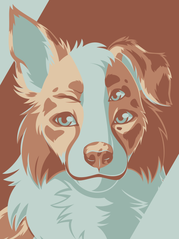 [A vector portrait of an anthro herding-type dog with four eyes, drawn in flat colors: two shades of medium brown, two shades of light teal, and light yellow]