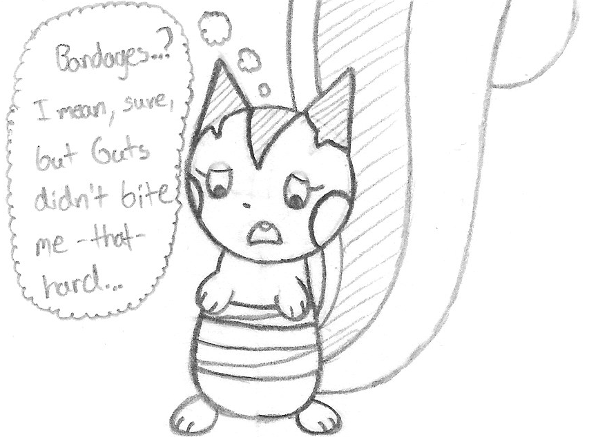 6) The second attempt to have Tapi stand out involved using a wrap, referencing the time where she was bitten by her would-be mate, Guts, mid-battle by accident. I'm with Tapi on this one too, not quite the fit we're going for.