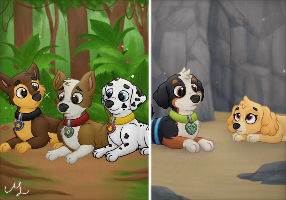 “Huh?!” The boys called out in unison. Marshall taking a few steps before tripping over himself and landing on Zuma.