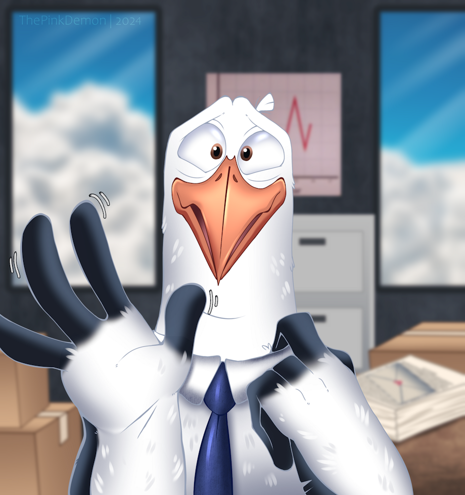 Someone entered Junior's office! He waves awkwardly and tugs at his tie like a dumb goober.