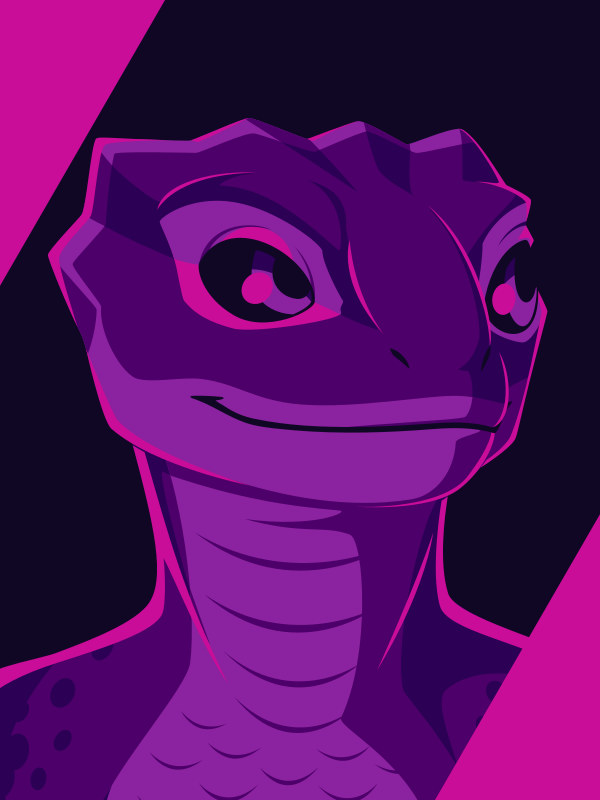 [A vector portrait of an anthro crocodile skink, drawn in flat colors: black, pink, and three shades of purple]