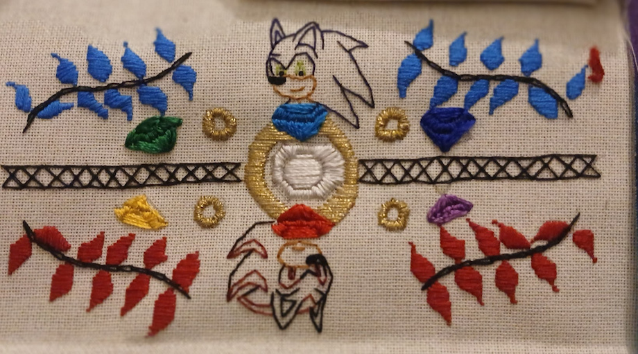 This piece blends several textile techniques to capture a powerful moment between Sonic and Shadow. The main figures are created using applique, cut from various scrap cloths and stitched down to create that soft, blended look. The background detail, including the palm tree, flowers, and the lovely heart elements on the side, are brought to life with hand embroidery stitches.