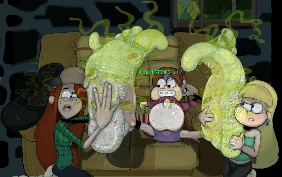Mabel bloats out on junk food as her unwilling worshipers rub her huge, fat, sweat-soaked feet