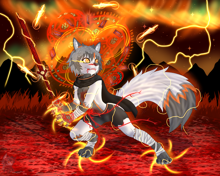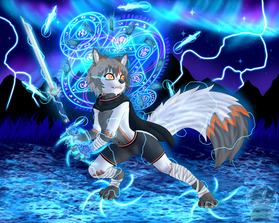 Azure haze dotted the night sky as lightning came forth, enwrapping a fluffy fox boy as he conjured lightning daggers in the sky, cards of a spell deck swirled forth as Ion levitated the sword in his hands as Azure Aura engulfed it, lightning blades forged in his hands as drips of Æther leaked from his right eye as his new Ithereal power was being tested out. "Ok Ion, that's enough" A voice called out from a figure nearby as Ion nodded before the sky cleared to it starry night, the lightning fizzled out as Ion's sword fell back into his hands as he hoisted it onto his shoulder as he waled towards the nearby figure. "You are getting better at controlling it" Sage Fenrir said as he placed a hand on Ion's head, "how's your heart doing?" "It feels great" Ion answered as he started feeling the large scar on his chest from his surgery, his growing fur was now starting to cover a bit, "the pain has basically all subsided, the doctors patched me up really good" Ion continued making a cheeky smile" "Good, just keep an eye on it" Sage Fenrir said as he lifted his hand from Ion's head, "it was badly damaged when you went rogue and you are still recovering, so just make sure not to over do it at the moment, understand?" "Yes master" Ion replied to his Sage mentor as Fenrir gave him a nod, "well as long as he does that, I can keep him from Awakening this early" Fenrir muttered under his breath but Ion caught on a few words, "awakening from what?" he asked as Fenrir looked a bit shocked. "Oh, er.. nothing, just that... making sure you get plenty of rest that's all" Fenrir replied, "oh, ok, don't worry I will" Ion responded as the two started to walk back towards the Spellcrafter's Guildhouse where Ion had been staying since his incident and surgery, as the Magus' de Blanc were still looking after him during this part of the recovery, with Sage Fenrir getting permission to take Ion out once in a while to help him handle the new power that awakened within him, the Æther Leak. "Say Ion" Sage Fenrir started saying as Ion looked up towards him as they walked, "you are about to rejoin your classes in a week, have you figured out what you are going to do about your Magus outfit? The outfitters are still waiting for your specifications" "Oh, for now I will just go like this" Ion said as he put his arms out in a gesture to posture what he was currently wearing, which was not much besides some shorts and his hooded cape which was the only thing left from his previous attire before the incident. "You know that will probably not fly within the guild" Sage Fenrir said with a chuckle, "i think the notion of the 'Fluffy Magus' is getting to you a bit" Sage Fenrir continued as Ion gave him a scorn. "It is not like this will be permanent" Ion said sounding a bit annoyed, "I am still figuring out how best to attune what I am now and how to fit it all into my being as a Magus, so I don't want to make my attire decisions too lightly" Ion continued twiddling his fingers a bit. "Ok well, decide quickly as I won't be able to cover for you for too long" Sage Fenrir mentioned as Ion gave a nod, "don't worry I have a few ideas, just a couple of things to iron out" Ion reopened with a big smile as the two entered the Guildhouse, Sage Fenrir then took Ion back to his recovery quarters before settling down himself back in his study.