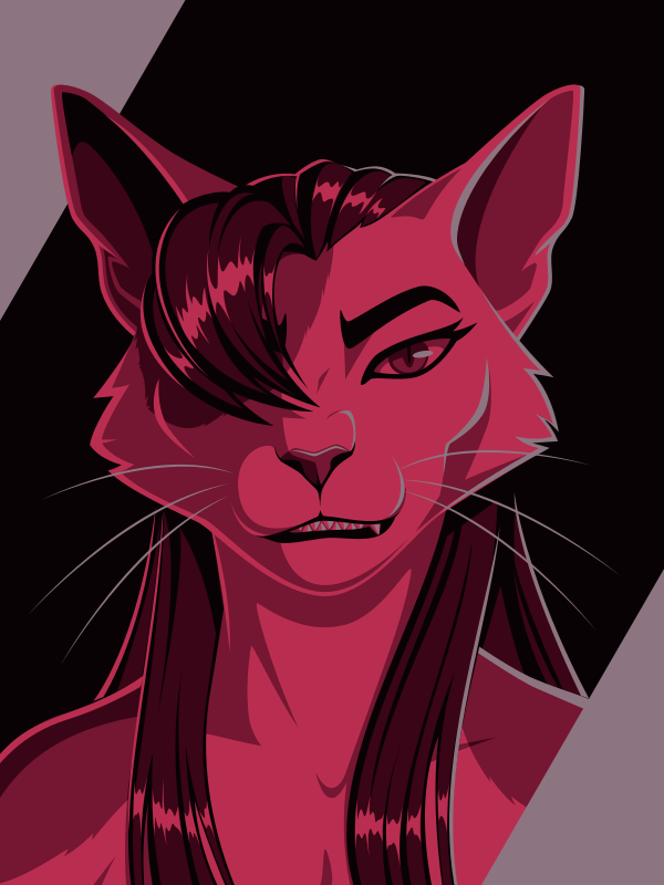 [A vector portrait of an anthro cat with long hair, drawn in flat colors: black, gray, and three shades of pink-red]