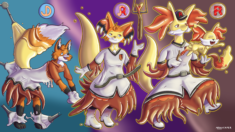 ALT Description Text (Re-posted): A digital art sequence featuring an anthropomorphic fox OC named J.D. transforming into a squeaky rubber Pokémon, a Delphox, for the organization "Team Rubber Rocket." 1. In the first panel, J.D. is being sprayed by nozzles, layering shiny latex goop onto the tail, body, and footpaws. J.D. has a zoned out expression, mouth agape and almost grinning, looking at something off-panel. 2. In the second panel, the goop overtakes J.D., forming into rubbery, more exaggerated vulpine features befitting of a Delphox. An off-white and black-trim uniform coat with gloves and boots forms, complete with logo of Team Rubber Rocket, and a shimmering dress drapes towards the ground. She smiles with purpose as a rubbery stick, a wand, descends towards her, for her to take. It is her purpose, her assignment. 3. Clutching the wand and fully assimilated into Team Rubber Rocket, Recruiter Delphox launches faceless rubbery Fennekin from the tip of her wand. One can only wonder what these Fennekin can do...