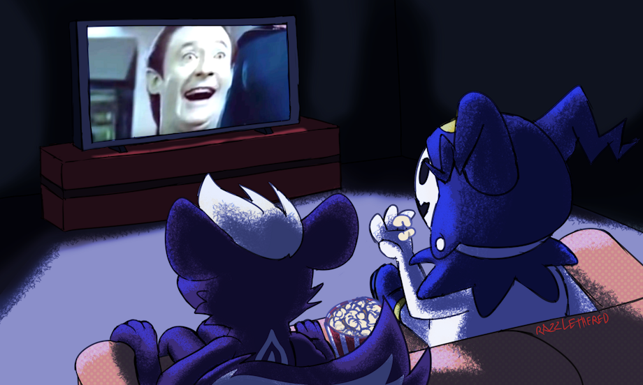 Gift art I made for my close friend Daniel, we often do watch parties together and are currently watching through Star Trek: TNG hence the inspirations for the art and the image on the tv. It also by pure coincidence coincided with his birthday, so that's nice :)