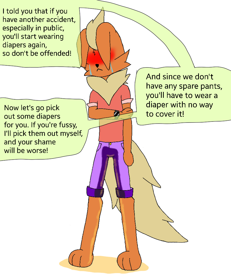 This Flareon has already had eight accidents in two days, and his mom is very unhappy about it, and her patience has run out. Flareon's mom also scolds him very loudly when he tries to hide his accident, but unfortunately for him, the smell of his urine lingers.