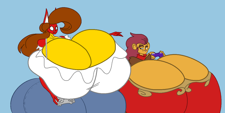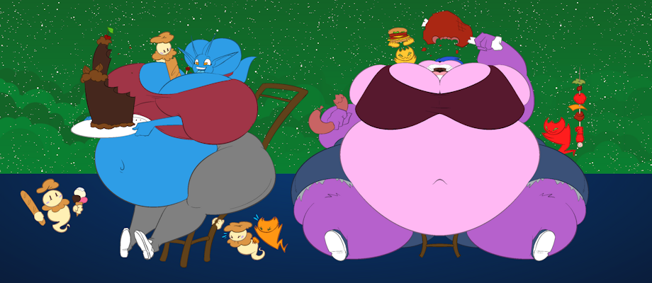 Postprandial Pampering: With all the food gone, the minions can revel in their handiwork. Nye of course is proud of her gains. Pii'thya just loves food, and tends to freak out when she balloons so much. She has a figure and a reputation to uphold!