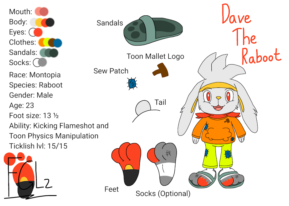 Name: Dave The Raboot Race: Montopia Foot size: 13 ½ Species: Raboot (Pokémon) Age: 23 Gender: Male Ability: He can do flameshot on his feet by kicking any round stuff like balls or rocks to creates a fireball, he also do toon physics manipulation on himself which is immune of any physical trauma due to his toony ability and he can do bringing his toon based weaponry on his special pocket on his hoodie.