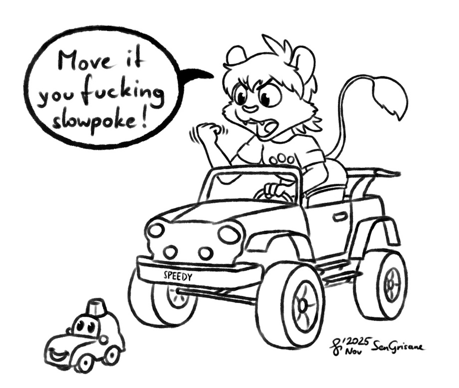 ComfyTail ( https://inkbunny.net/ComfyTail ) jumps in my police push car and giggles as i drive af