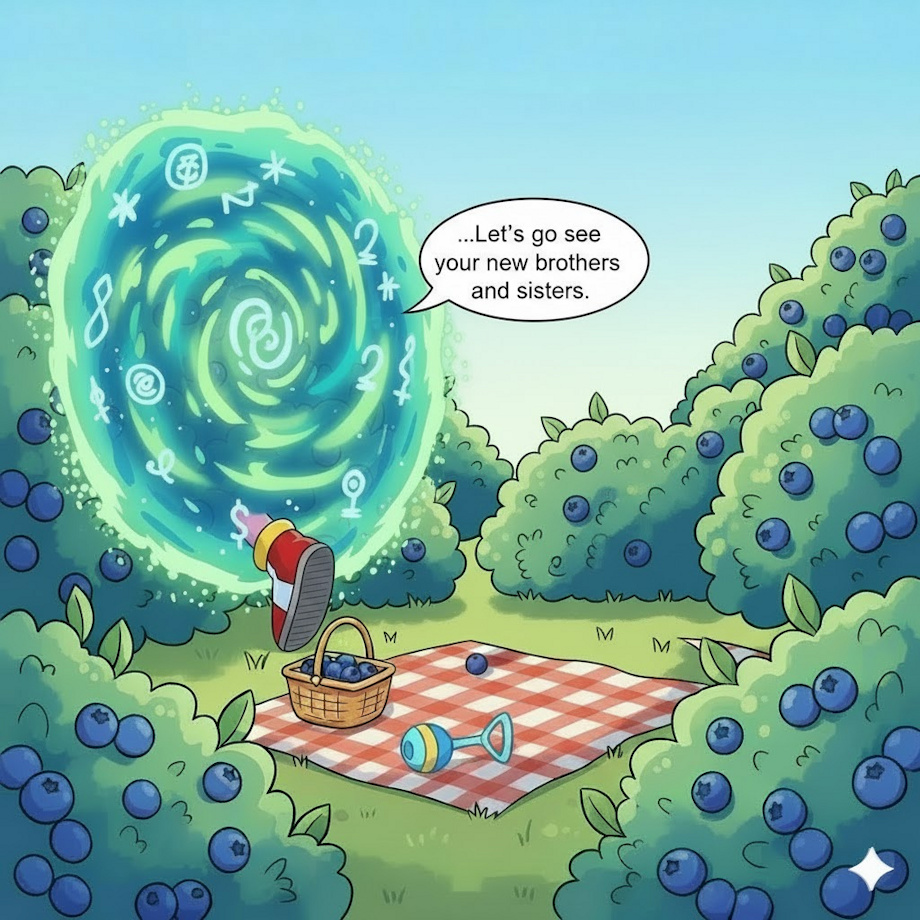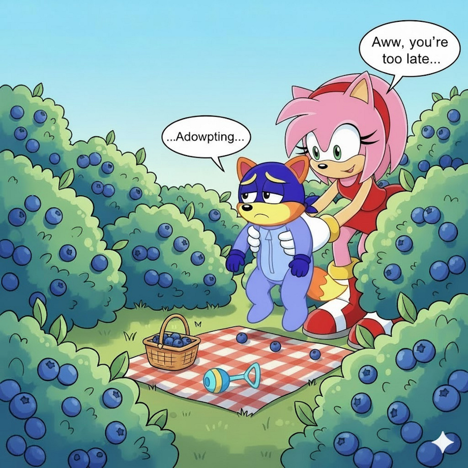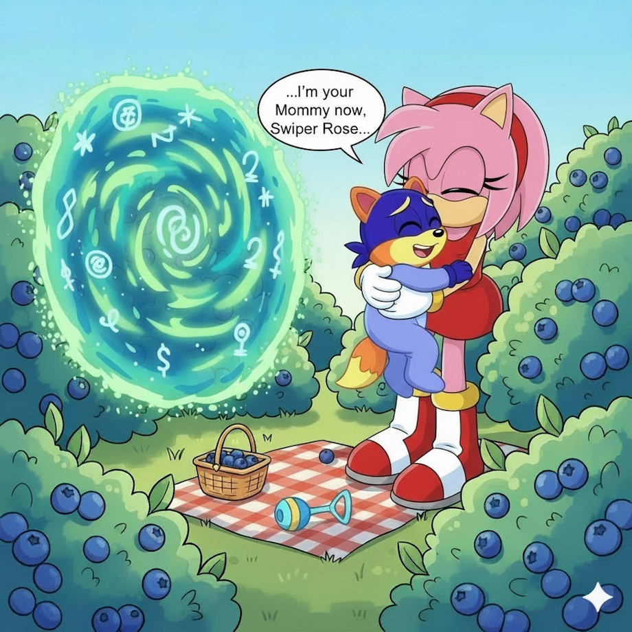 While having fun picking some Blueberries, Baby Swiper hears a rustling nearby that wasn't him. Baby Swiper heard stories about Amy Rose; a pink Hedgehog Girl who went out of her way to go and adopt all of Swipers' playmates as her babies. A small part of Swiper was afraid of being taken away, but another part was wanting to be adopted by Amy if it meant being able to play with all his friends again.
