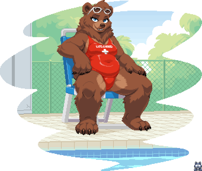 Character design for Mavis the bear lifeguard. I tried including a background this time.