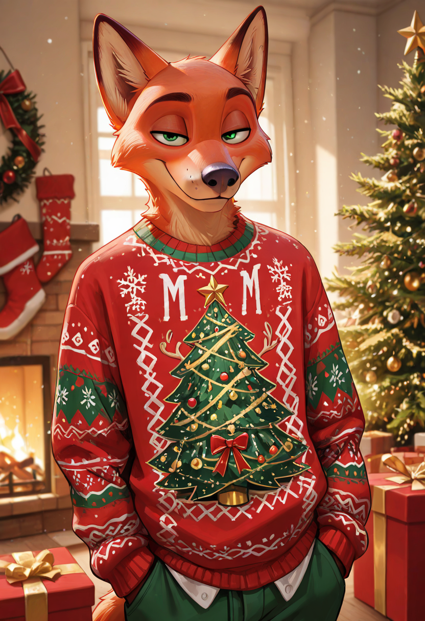 masterpiece, best quality, amazing quality, Christmas theme, Christmas tree, Christmas present, Christmas sweater, nick wilde
