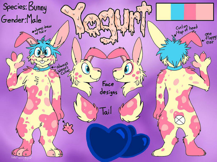 slim-ish pastel yellow bunny with salmon/pink splotches covering his body, blue eyes and shortish blue hair. His right ear is a little flopped all cutely