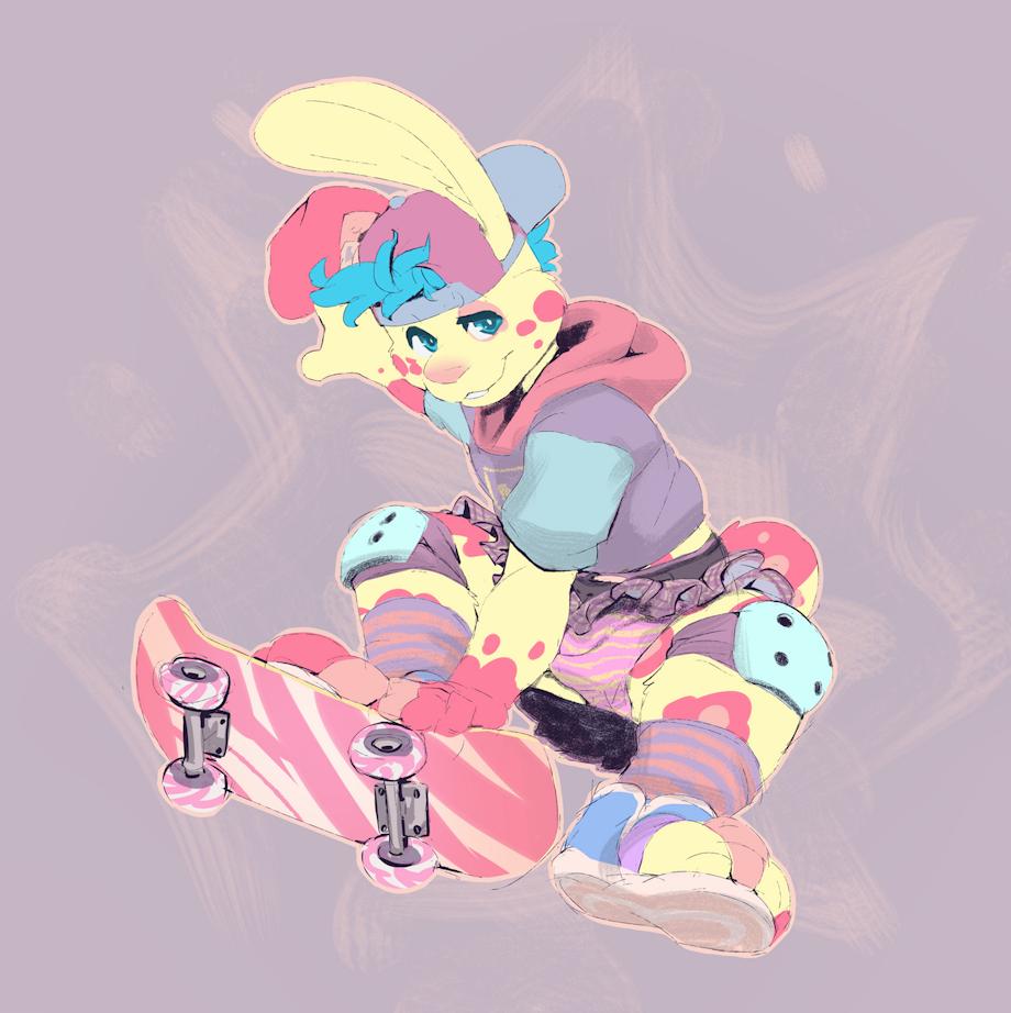 slim-ish pastel yellow bunny with salmon/pink splotches covering his body, blue eyes and shortish blue hair. His right ear is a little flopped all cutely