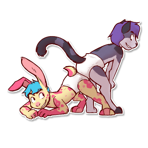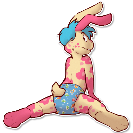 slim-ish pastel yellow bunny with salmon/pink splotches covering his body, blue eyes and shortish blue hair. His right ear is a little flopped all cutely