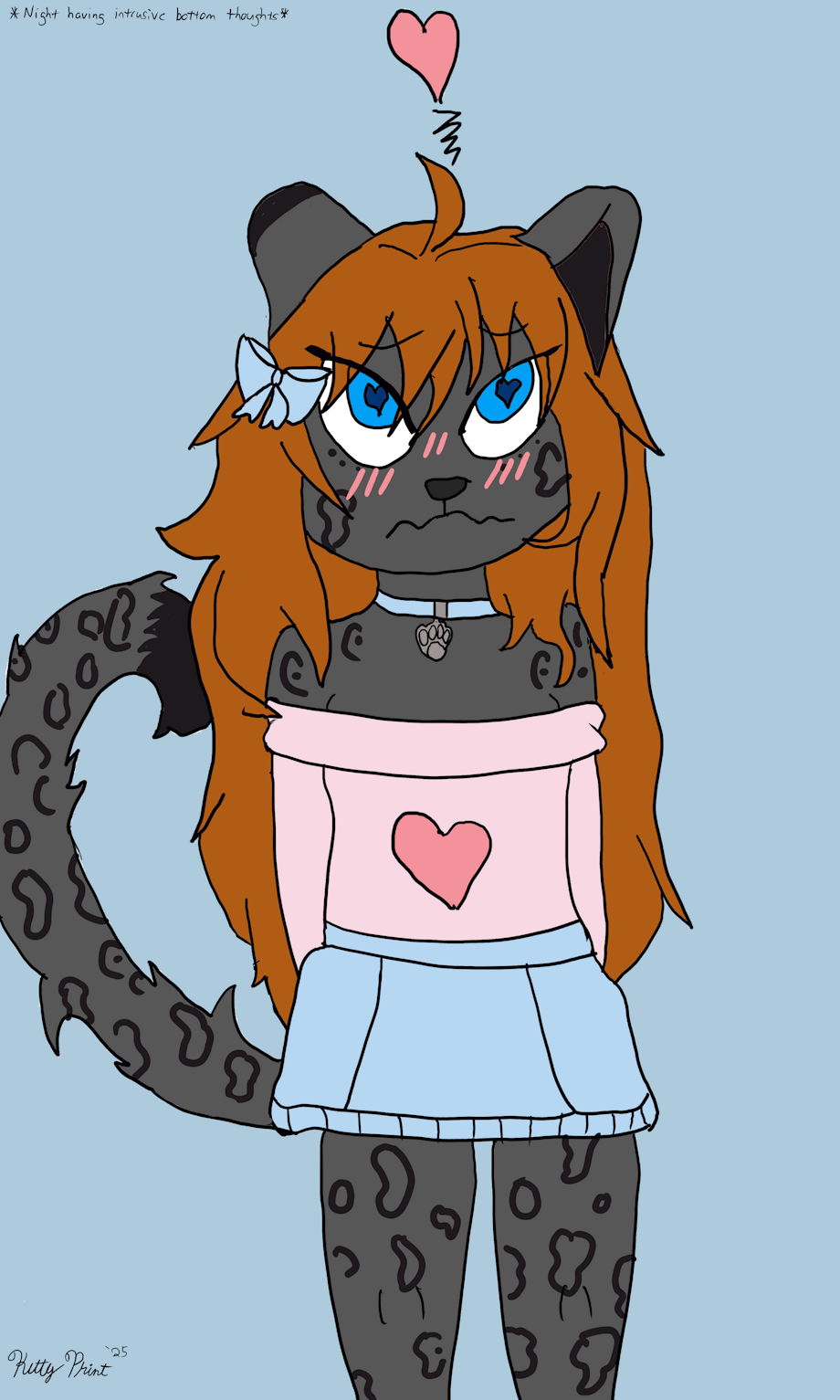 Poor Nightshade is dealing with some things. When you are a little kitty wearing pretty dresses and hair bows... its hard to not have those pesky intrusive bottom thoughts. Even when you are a boy!