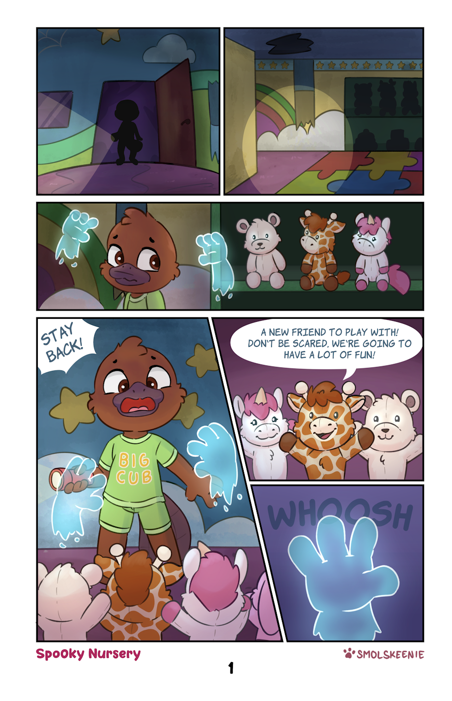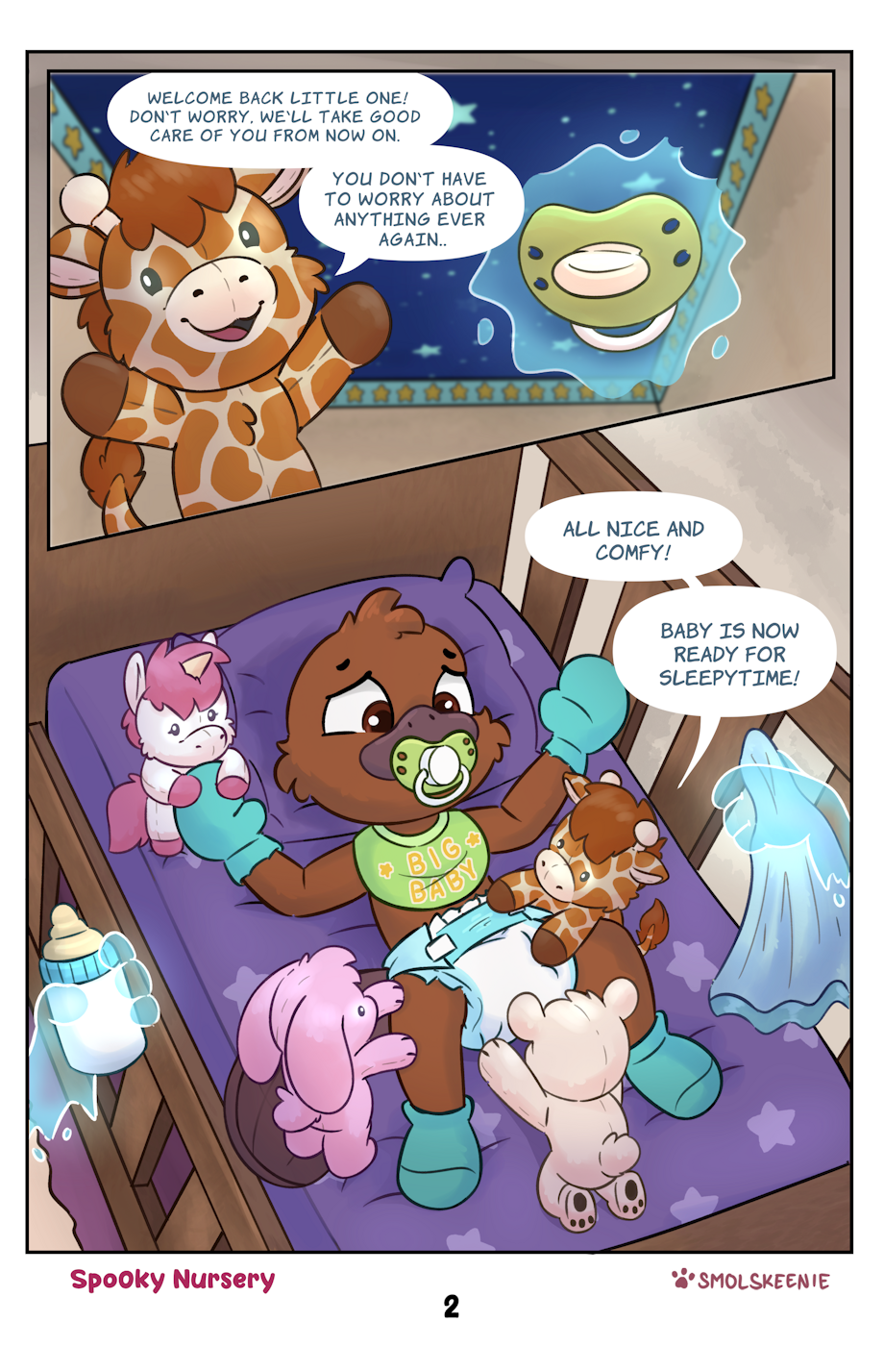 I am not afraid. Benny says this to some younger cubs outside the haunted nursery. One of them says "if you are not afraid go in and stay in for 10 minutes. I will give you my large lollipop. that's it, my shirt says I'm a big cub I'm not afraid of an old nursery. Benny enters the nursery with his flashlight. he hears hehehe in the distance. you'll have to do better than that to scare me. we will be friends forever. I-Im not afraid of you. he feels a hand touch his shoulder. when he turns around there is no one there. "lets be friends" Benny turns to see plushies floating towards him. stay back he meekly says as they get closer the plushies get closer to Benny. there are magical ghost hands appearing around him. two grab his shirt, which Benny tries to hold down. stop that, don't pull my shirt. they don't listen and pull my shirt over my head. my fear gets the better of me; I begin to wet my shorts. poor baby had an accident, let's get you cleaned up. Benny gets lifted by the ghost hands. they put him on a changing table. He is strapped down; the wet shorts are removed and put in a laundry basket. his undies get pulled off slowly. you don't need these, they say as they put the undies in the trash. they grab a few baby wipes and genteelly wipe Benny's penis and bottom. they apply a big dose of baby powder. the diaper gets put on very slowly to emphases Benny's humiliation since big cubs don't pee themselves. the ghost hands pick him up and places him in a crib. the plushies welcome me back to the nursery. a pacifier floats into my mouth. the plushies put baby mittens and booties on me. a blanket and baby bottle of milk come close to Benny, getting him ready for sleepy time. later that night the cubs that got Benny to go into the nursery came to the back door. they knock on the door. the plushies open the door. "did you cubs have accident in your pull ups?" yes we did we are sorry can we try again with new pull ups. yes little ones come on in your friend is having a nap time you can play later
