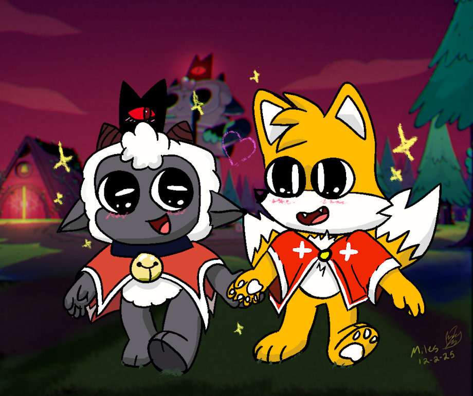 Tails is being welcomed in by the cute lamb leader. They seem to be hitting it off!