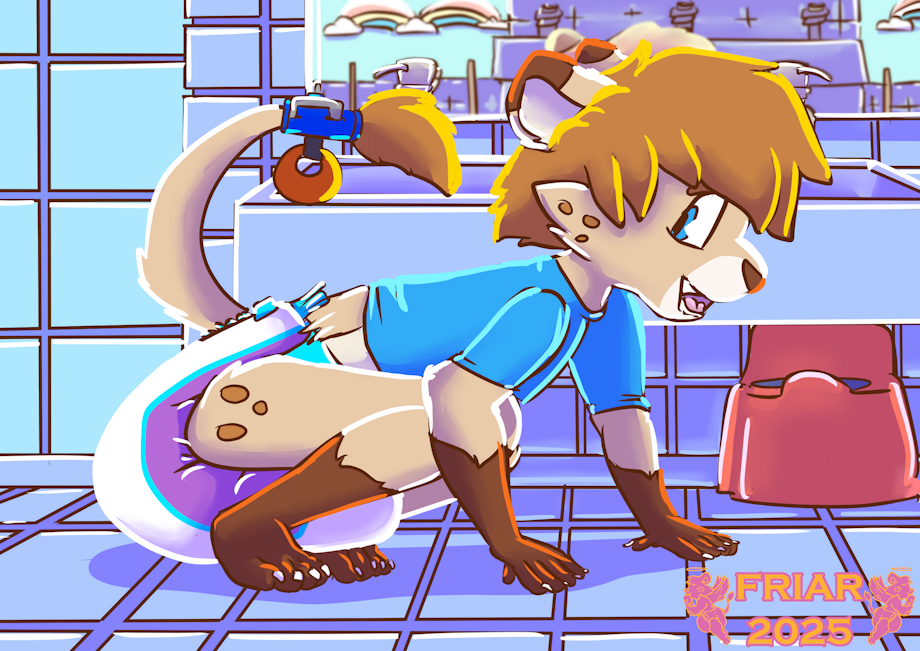 Illustration of Toffee the wet and messy diapered lion crouched down and pooping his diaper in front of the Pushies School sinks, the reflection in the mirror showing the back of the area. "Time to use my down B!"