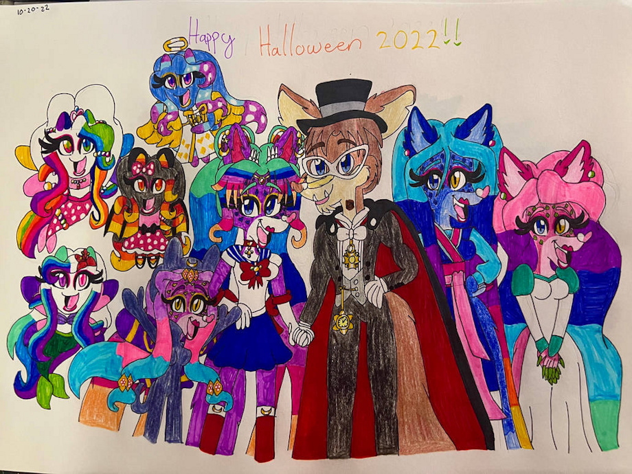 I’m dressed up as Sailor Moon, Breeze as Luna the Cat, Buck as Tuxedo Mask, Kat as Mulan, Jasmine as Odette, Aqua as Ariel, Gem as Pearl Mermaid, Flare as Minnie Mouse, and Pearl as Angel. ^^