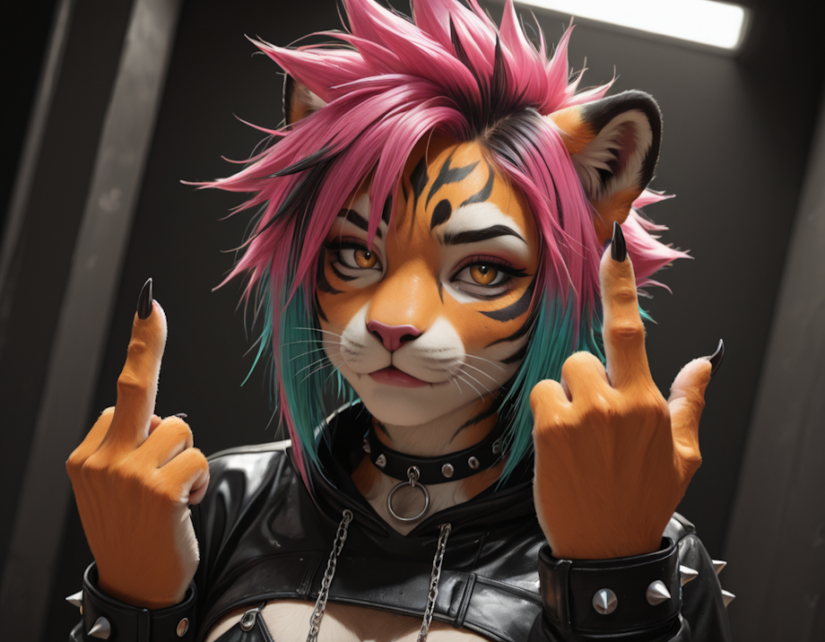 Parameters: masterpiece,best quality,amazing quality, 1girl, solo, furry, tigress, punk outfit, spiky hair, colored hair, middle finger, portrait, dutch angle