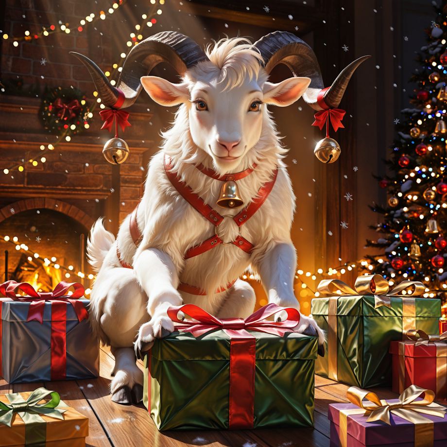 Bipedal, Sexy anthro goat, Julbocken, Yule goat, pecs, toned, male, fluffy body, white wool, large horns, jingle bells, harness, pouches, gifts, 4 fingers,
