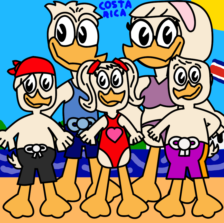 I did the DuckTales characters of the nephews and the magic girls and my oc characters as the triplets of their own in tropical places which took me a while on. I did Dewey and Webby and their kids (their son Swashbuck, their daughter Penelope/Penny and their son Feather-O) in Costa Rica.