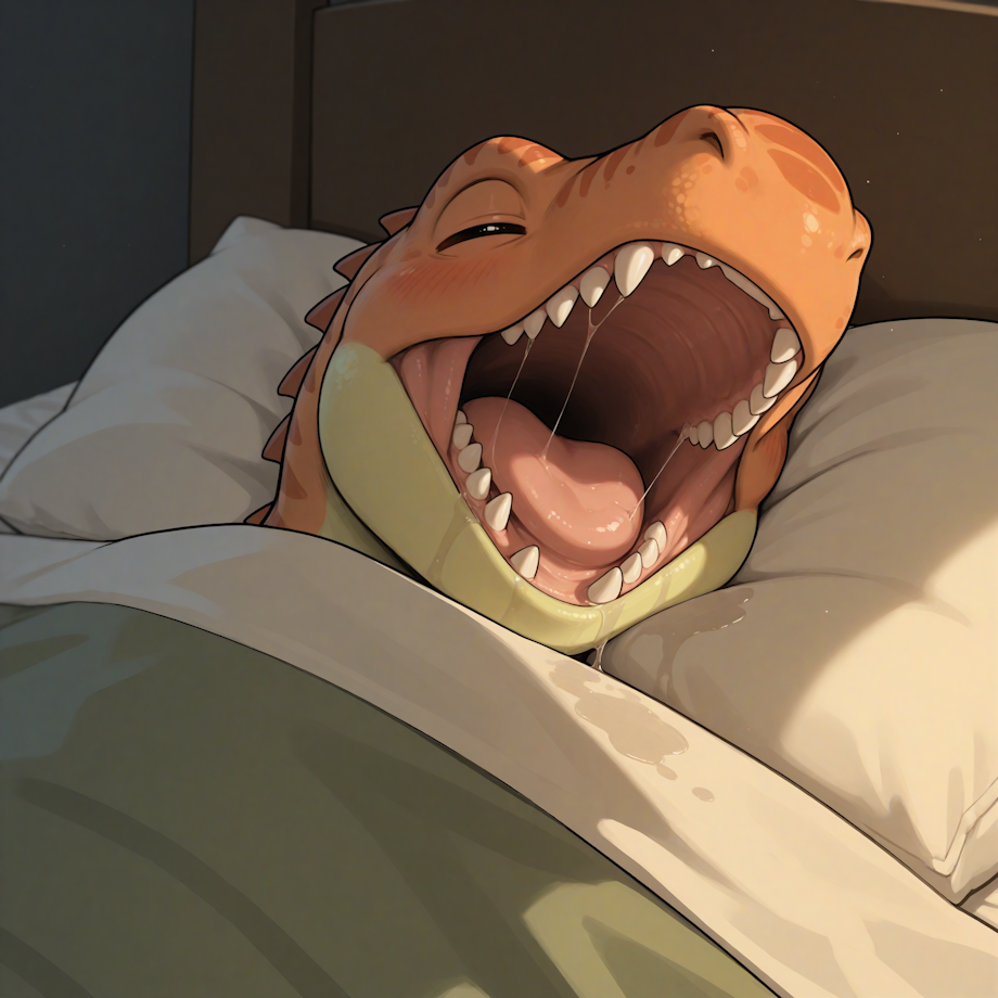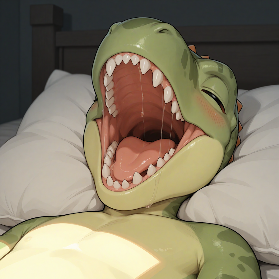 Prompt: (young male dinosaur, masterpiece, high detail, subtle soft details, soft lighting, anthro, best quality:1.5), toddler, cute, adorable, blushing, anthro, childlike proportions, smooth skin, detailed skin, naked, (sleeping, drooling, drool covered chin, drool pouring from mouth, drool on pillow, slack open mouth, soft mouth, round sleeping mouth, mouth open wide, yawning mouth, closeup on mouth, inside of mouth visible:1.3), deeply asleep, expressionless, face on pillow, drool stain spreading on pillow underneath mouth, solo