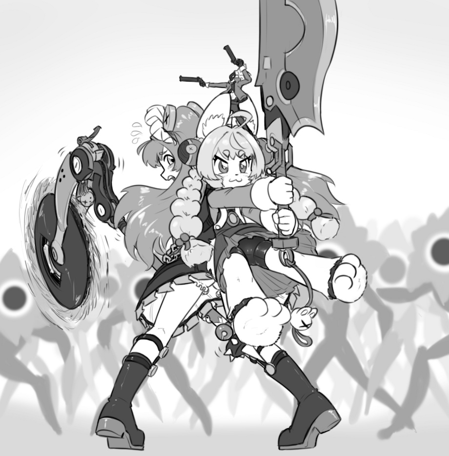 Awww, fun concept! Cute Corin flusteredness, and Zhao being so up for this is great too. Dangling right off an already petite character's back! Good spats as well. They've got plenty of firepower between them with their comically oversized weapons! (Also starring Billy, apparently.)